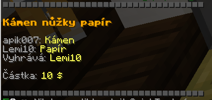 Jedná se o prostý hod mincí. Navrhneš nějakému hráči tuto hru + zvolíš částku o kterou se bude hrát. Zároveň si zvolíš, jestli budeš hrát **kámen, nůžky, nebo papír**. Výherce pak získá od druhého hráče danou částku.